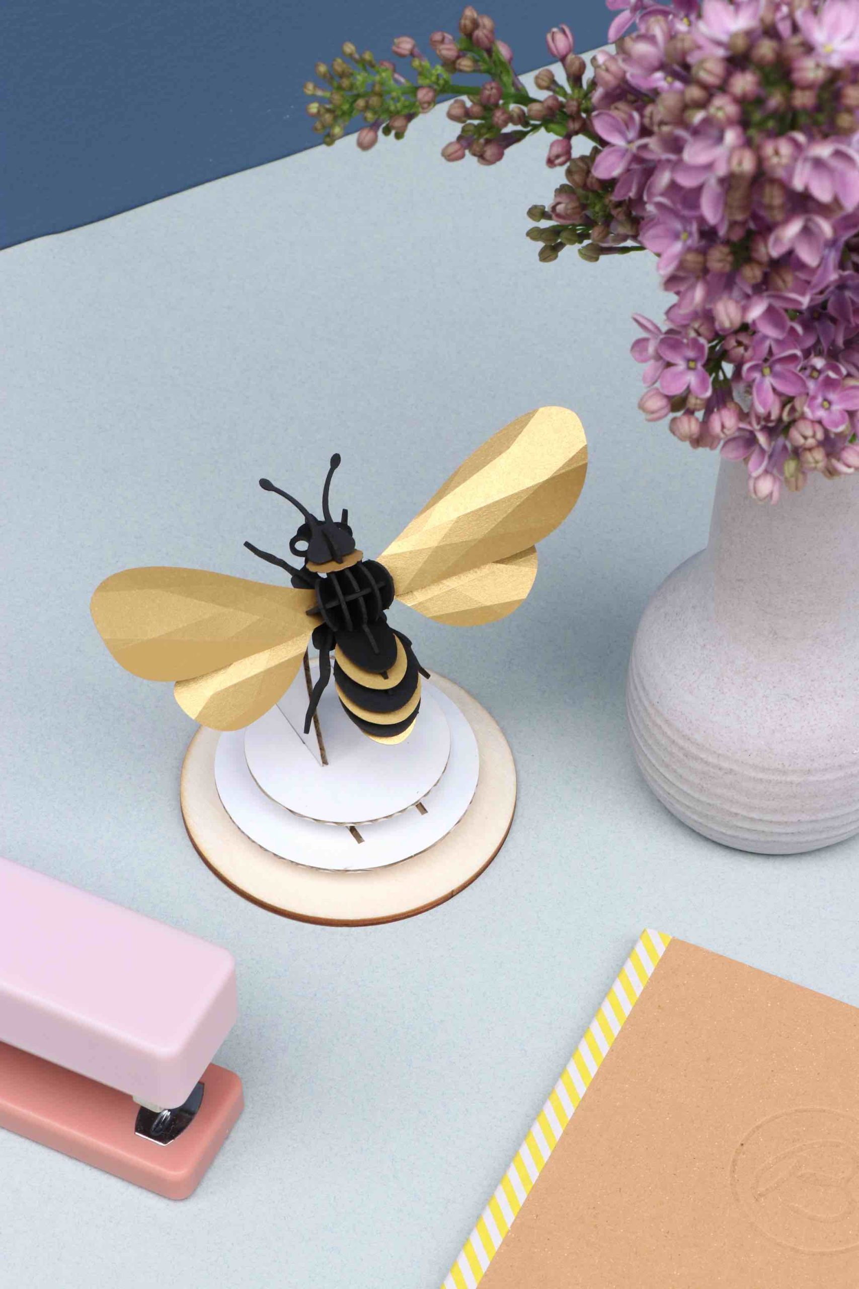 Montaje: No requiere herramientas; las piezas se ensamblan mediante pliegues y encajes. Se puede utilizar una pequeña cantidad de pegamento para mayor firmeza, aunque no es imprescindible. Diseño realista en amarillo y negro con alas semitranslúcidas.