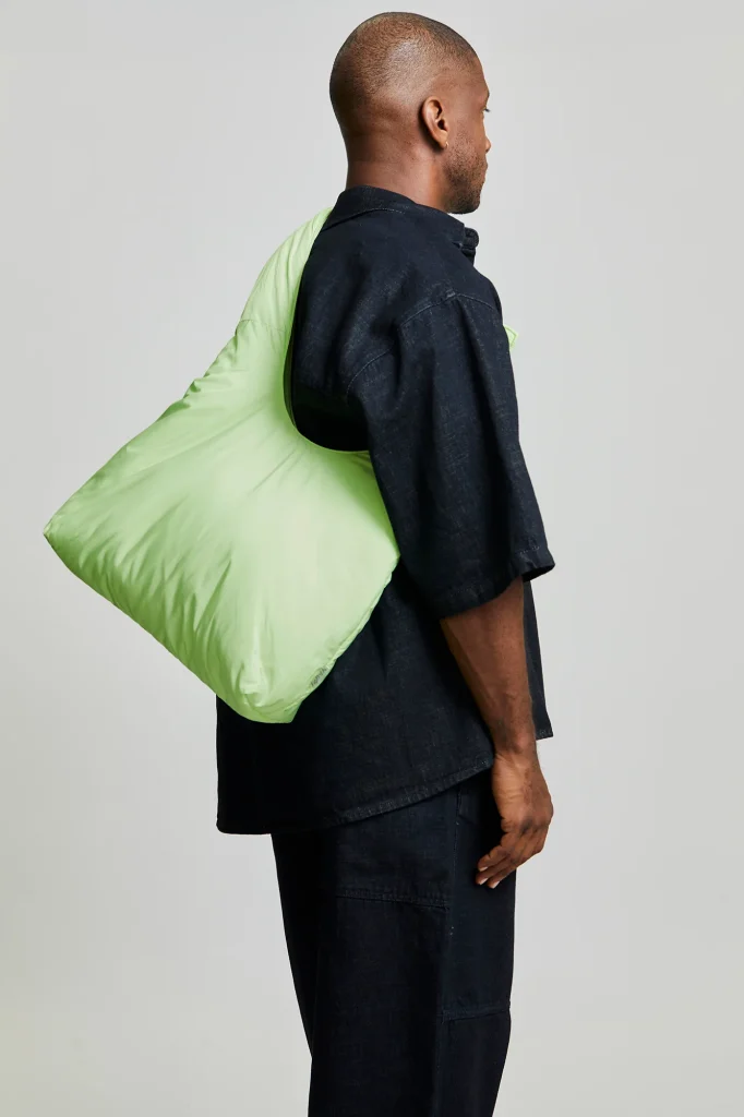 Bolso acolchado diseñado para ser utilizado tanto como bandolera como al hombro, gracias a sus lazos corredizos ajustables. Su tejido 100% hecho con poliéster reciclado y acolchado lo hacen muy ligero, suave y agradable al tacto.