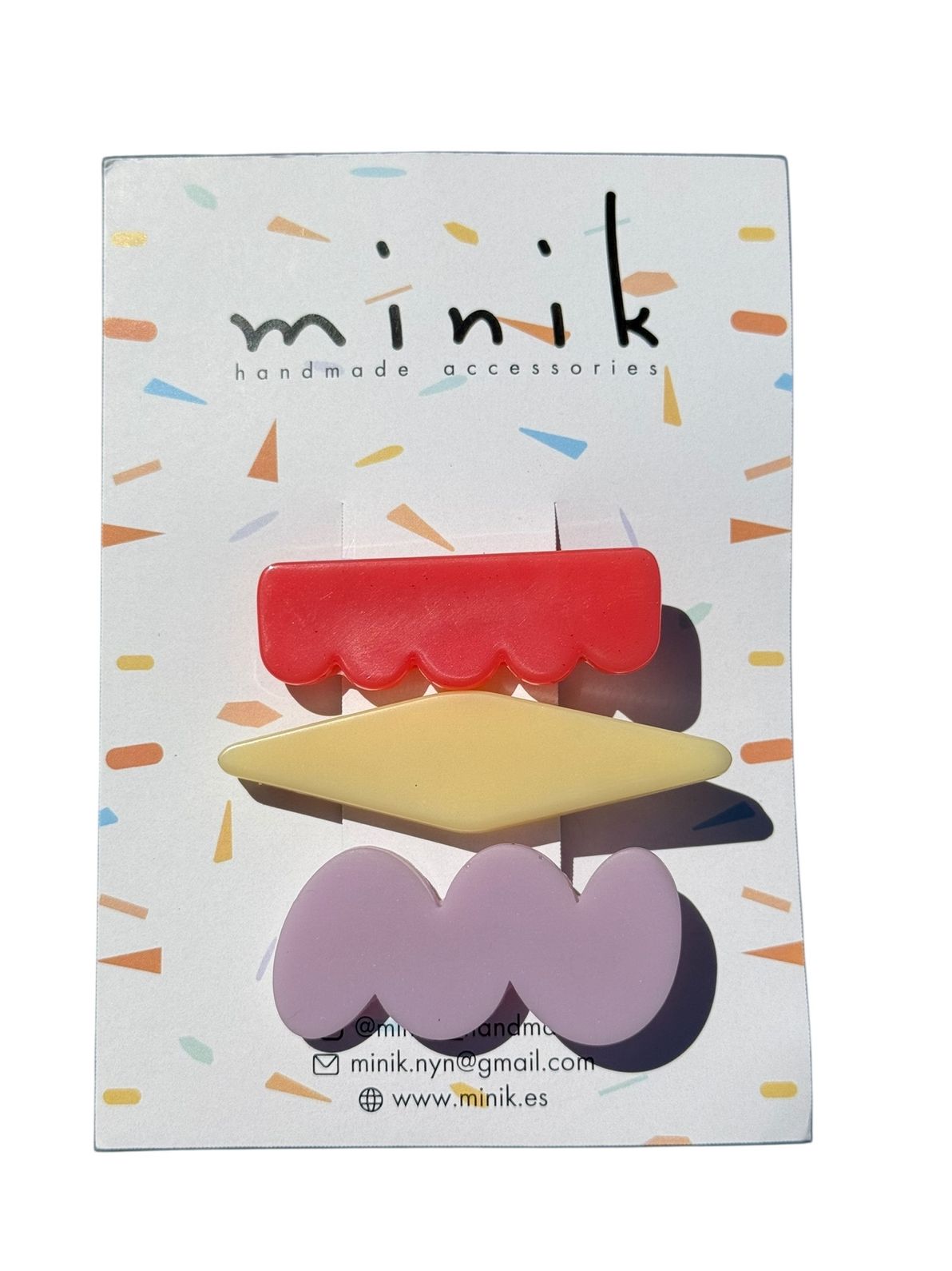 Está realizada de forma artesanal en Bilbao, con resina epoxi que aporta color y resistencia, montada sobre una pinza metálica tipo cocodrilo que garantiza una buena sujeción en el cabello.