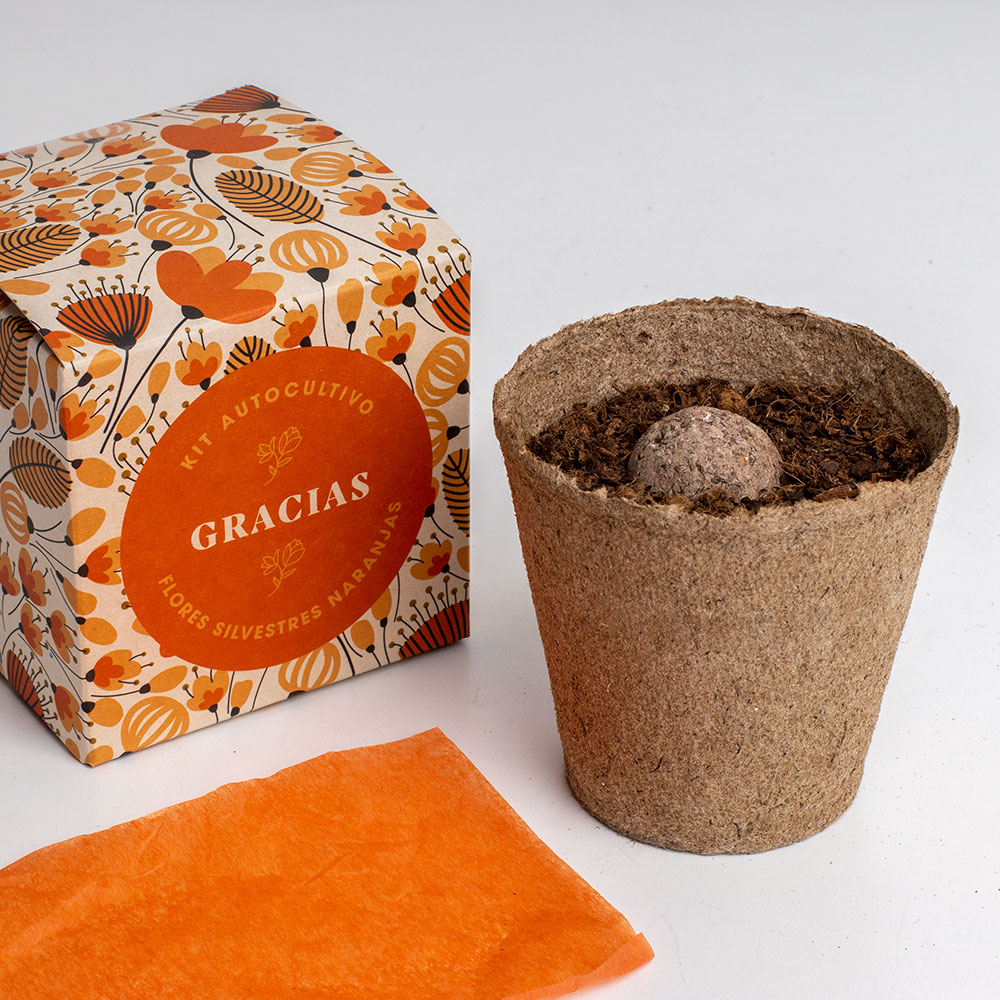 Un regalo ecológico y lleno de color para expresar tu gratitud. Este kit incluye una maceta biodegradable, una pastilla de sustrato y una bomba de semillas con flores silvestres naranjas (caléndula, capuchina y tagetes)