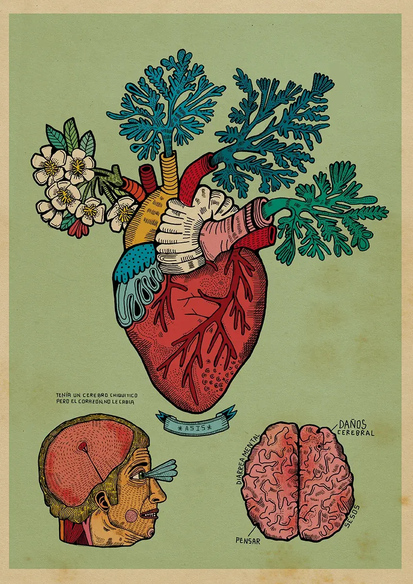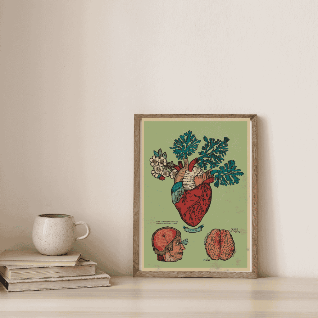 Un corazón que florece: esta obra fusiona lo orgánico con lo emocional, conectando la anatomía humana con la delicadeza de lo natural. Ideal para amantes de la ilustración poética y científica.