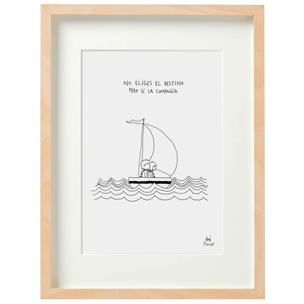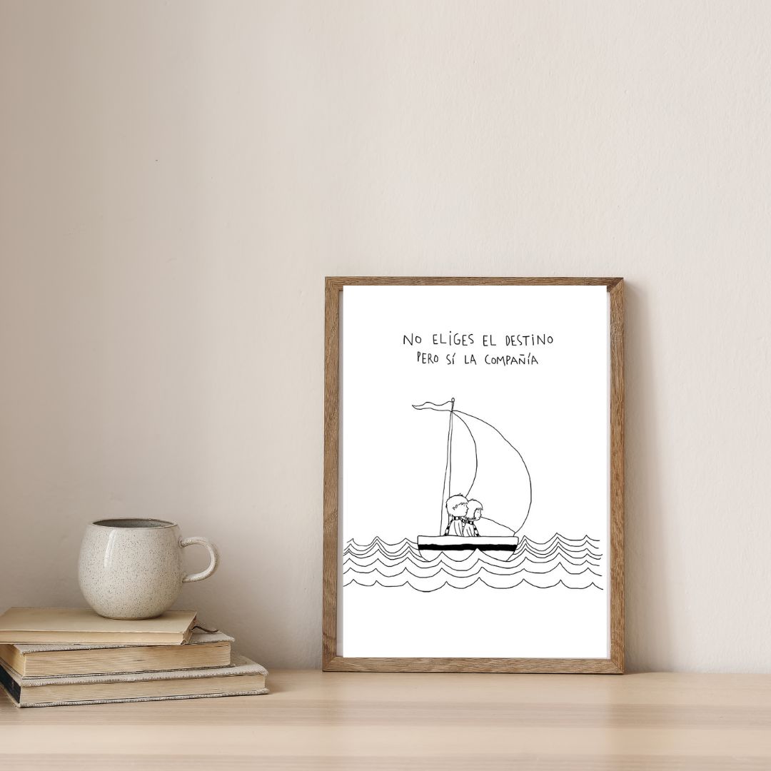 La ilustración sugiere que somos responsables de marcar nuestro rumbo, por pequeño que sea el barco. Su estilo minimalista, en blanco y negro, refuerza esa claridad de intención, celebrando la libertad, la introspección y la valentía de elegir pausar, mirar y decidir hacia dónde queremos avanzar.