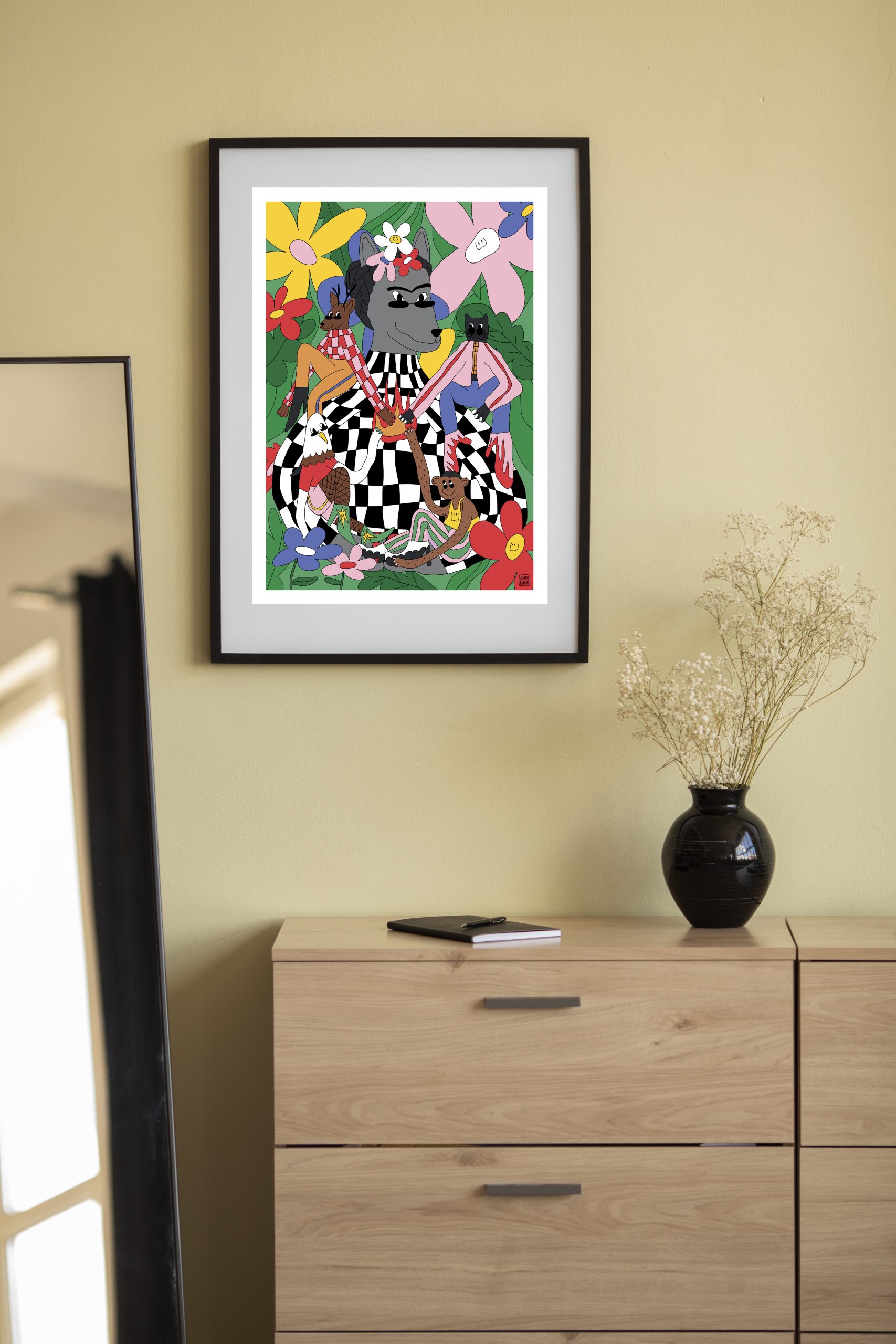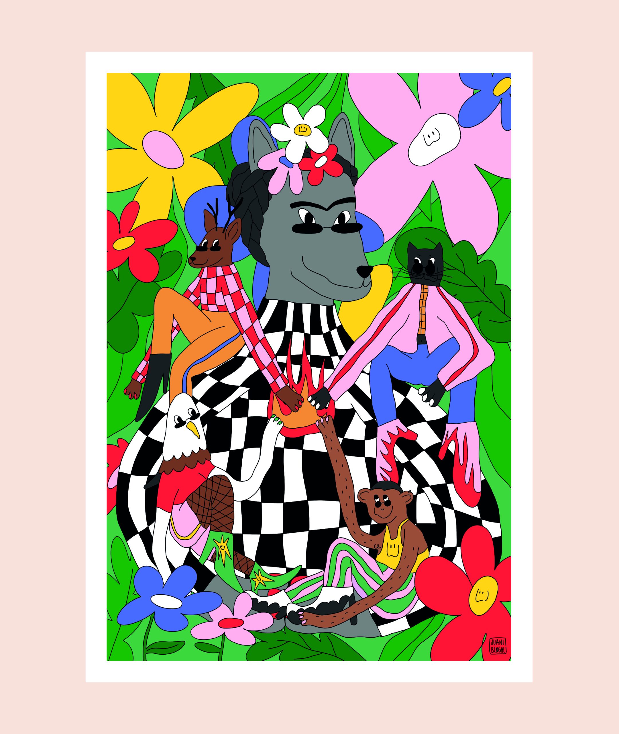Es una ilustración vibrante que celebra la figura de Frida Kahlo desde una mirada lúdica y decorativa. La protagonista aparece serena, rodeada de flores y animales. Los colores transmiten alegría y vitalidad. Con un estilo lleno de texturas, formas redondeadas y un toque surrealista esta obra es perfecta para decorar tu hogar.