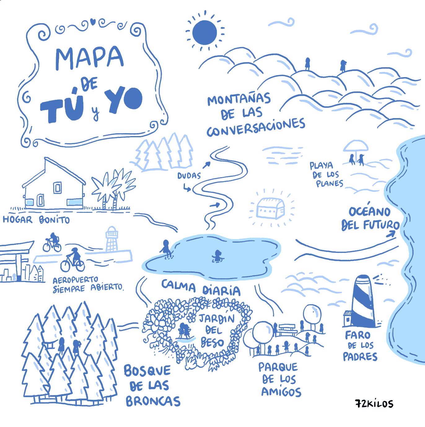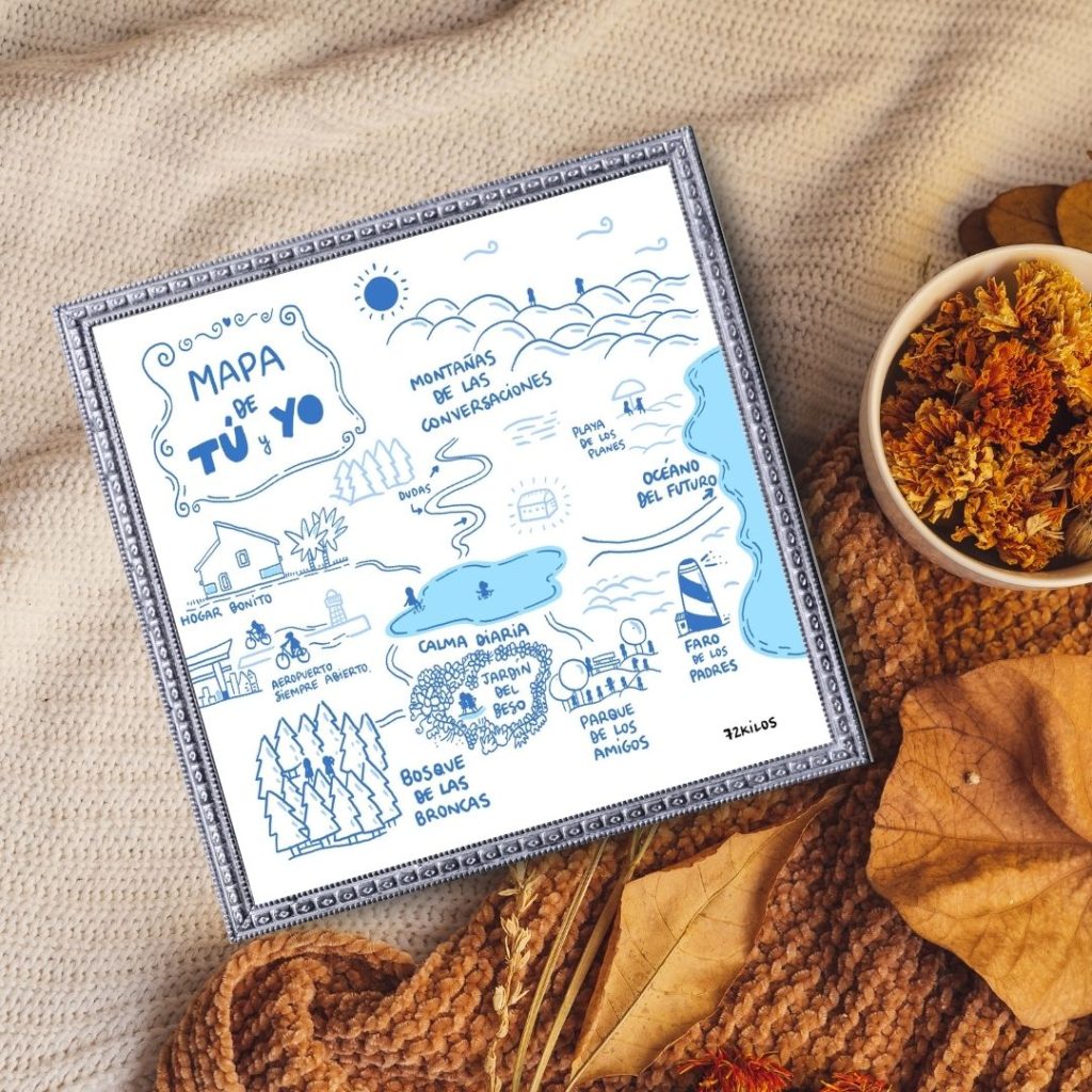 Esta lámina representa el mapa emocional y geográfico que une a dos personas, mostrando los caminos, encuentros y puntos clave que definen su relación única y especial. Tamaño 22×22 cm. Lámina impresa en papel couche mate 300grs y tintas de alta calidad. Con firma digital y con tarjeta exclusiva de 72 kilos.