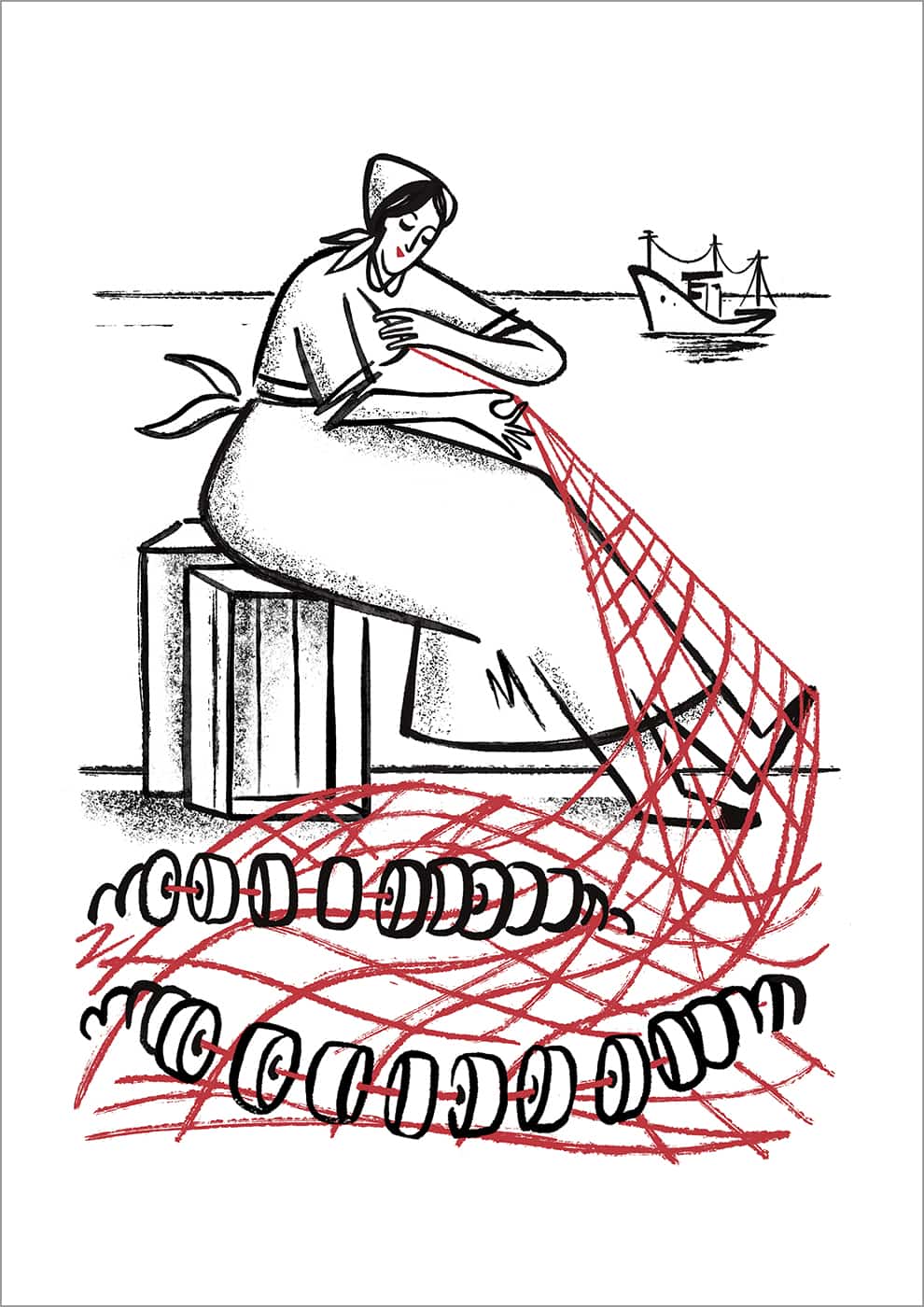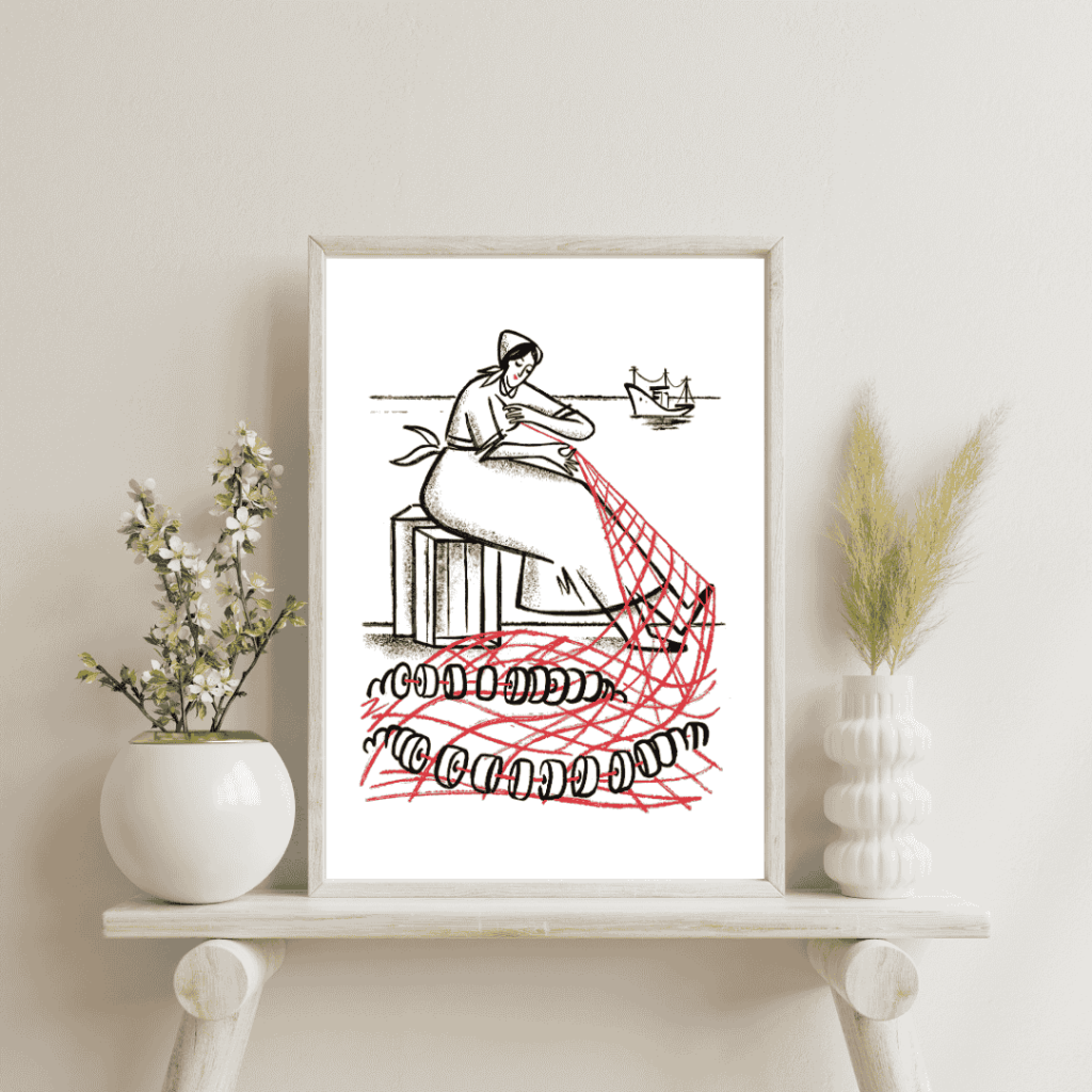 Esta lámina de Iker Ayestaran, ilustrador donostiarra reconocido internacionalmente, está inspirada en la tradición euskaldun y en los orígenes de nuestra cultura. Con su estilo característico, lleno de símbolos y narrativas visuales, consigue transformar un recuerdo colectivo en una obra contemporánea que funciona tanto como pieza decorativa como conversación asegurada en cualquier hogar o estudio.