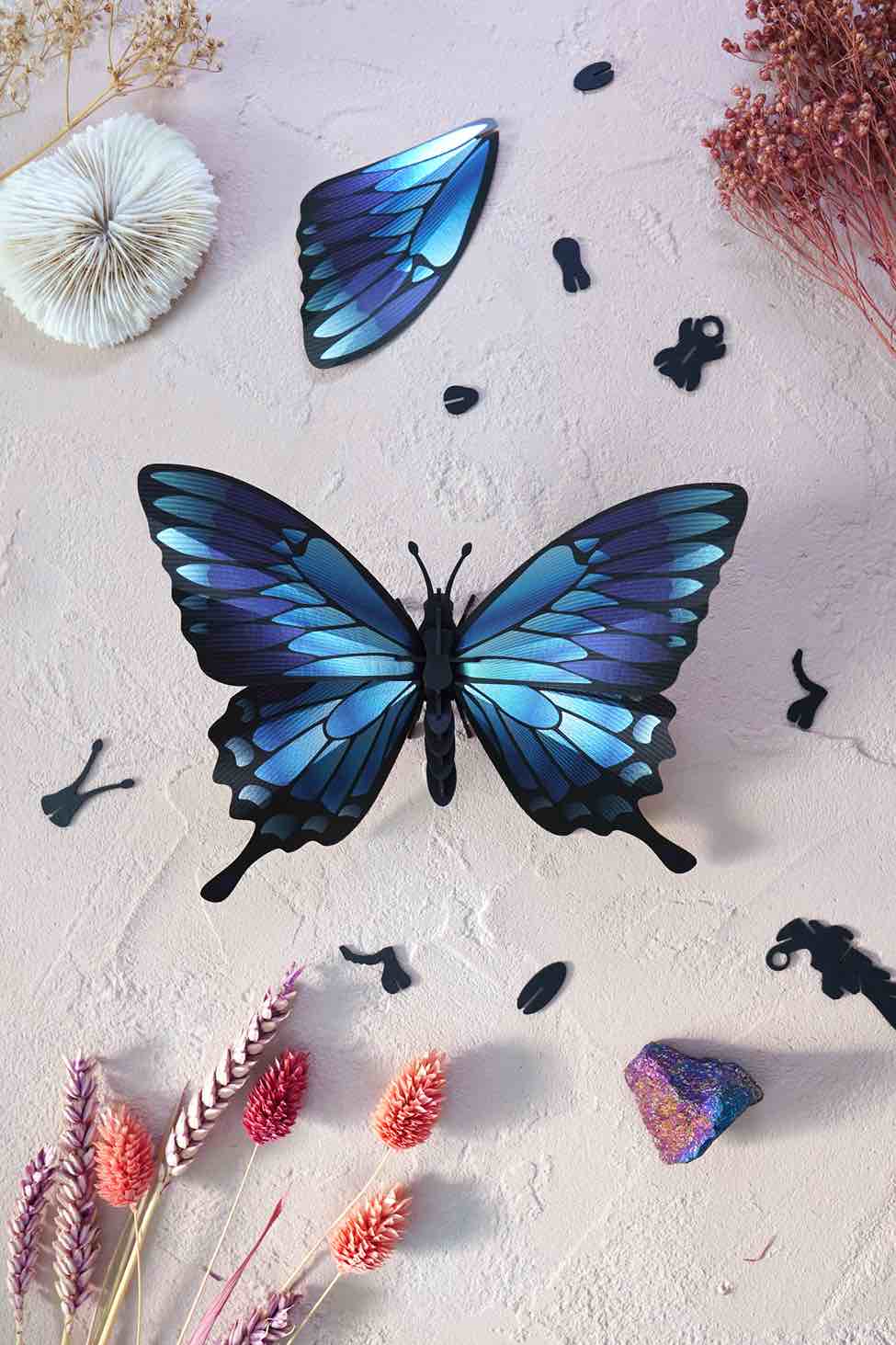 Un kit creativo de manualidades que te permite montar una vibrante mariposa azul en papel 3D, sin necesidad de tijeras ni herramientas. Ideal para decorar espacios con un toque natural, elegante y ecológico.