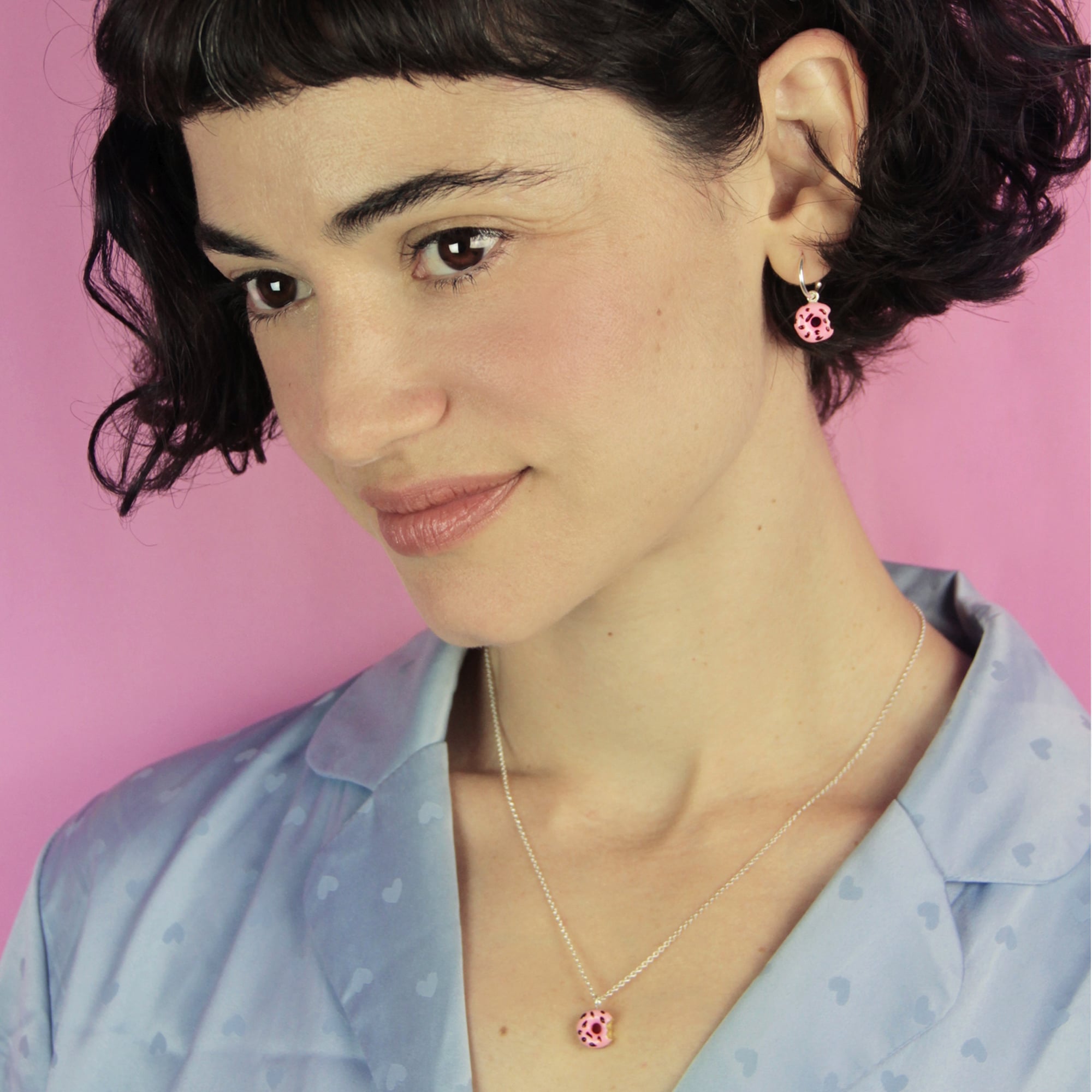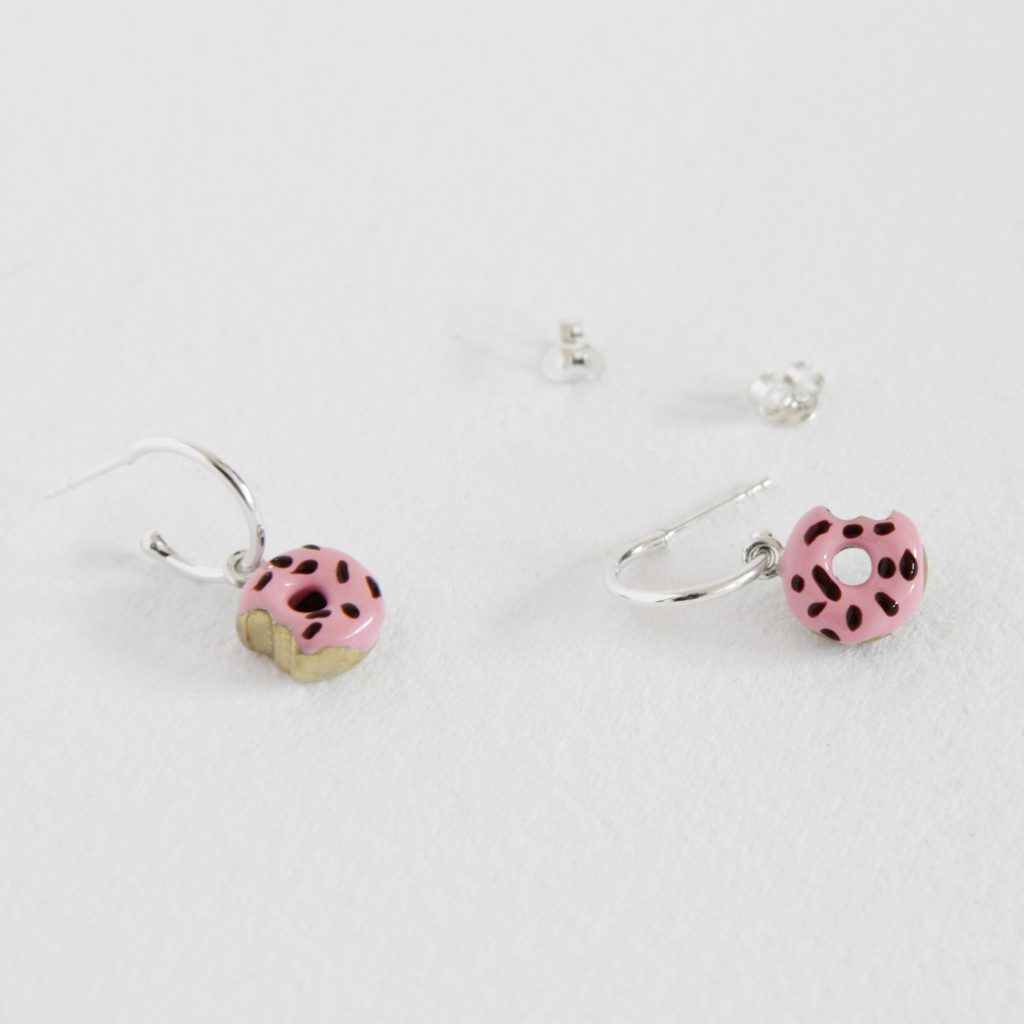 Pendientes tipo aro fabricados en plata, con cierre de tuerca a presión para un uso seguro y cómodo durante todo el día. De cada aro cuelga un donut realizado en latón, esmaltado a mano en un suave tono rosa y decorado con virutas de chocolate que aportan un guiño lúdico y original. Están hechos por Rubén, de Vacía La Nevera, quien combina creatividad y técnica artesanal para lograr piezas únicas que despiertan sonrisas. Perfectos para quienes buscan accesorios divertidos, diferentes y con un toque irresistible.