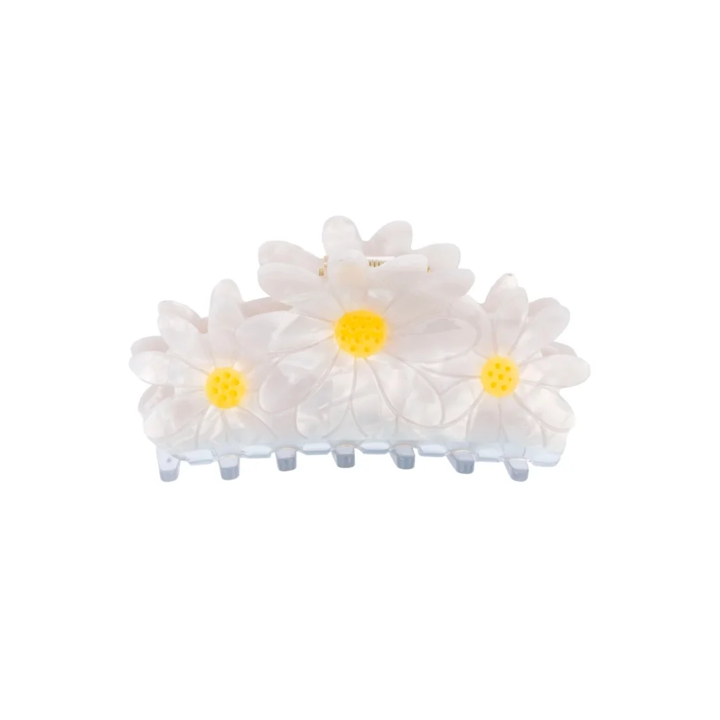Una pinza de gran tamaño formada por tres margaritas nacaradas con pistilo amarillo intenso, diseñada para dar un toque especial a tus recogidos y chignons. Ideal para quienes buscan un accesorio elegante, divertido y fácil de llevar.